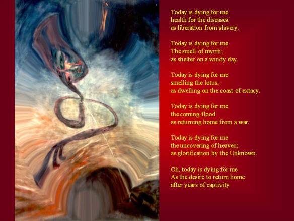 Is the Lady this soul mate ? Is she ready to rejoin the one she loves in the pavilion ? Or else, is she in quest of this lost unity ? Will she rediscover the primeval state where the being no longer sees a world filled with antagonisms, but complementarities which are melting into Unity. Indeed, duality does not belong to the manifested world, but to our perception of that world. As long as we stay divided inside ourselves, we will not be able to accept the world as it is and ourselves as we are in reality, that means unified. The moment however we overcome our sensitive perceptions, go back against the original flow, attain the integrating principle governing our senses and become aware of the Unity ruling the world, all fears, cravings and illusions attached to our dualistic perception of things and beings are flying away. We are ready to leave the world of senses to rediscover the unified state of senses and being. We are ready to go back home, to leave the outer world to re-discover our inner world symbolized by the pavilion.