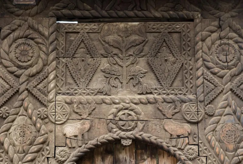 Each church in Maramureș features a carefully carved portal that leads into a sacred enclosure. Designs include rosettes, twisted ropes, and crosses carved in relief, symbolizing life, eternity, and the Holy Trinity. The doors themselves often tell stories from the Gospels or Old Testament, rendered in stylized forms passed down through local traditions. Walls and ceilings contain wooden beams marked with initials, blessings, or protective symbols.