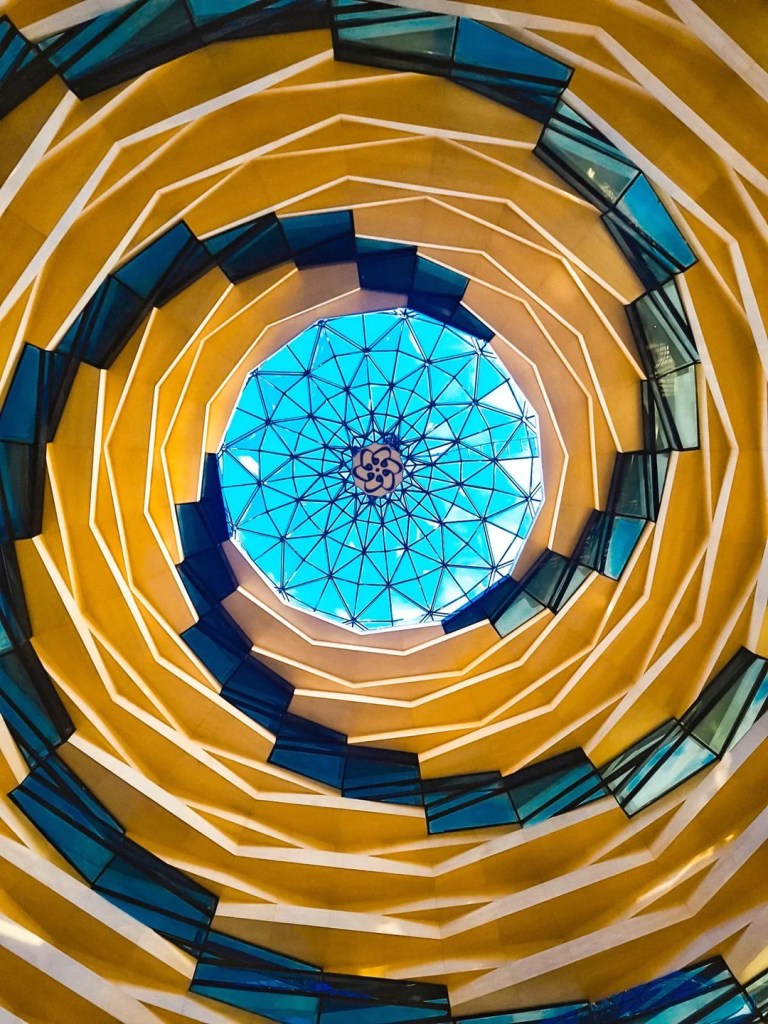 The building looks modern and remarkable from both the outside and inside. The walls of the main prayer hall are composed of glass archways with intricate lattice work. This design allows natural light to illuminate the building even on cloudy days. Sunrays penetrate the structure through the apex of the dome, which is itself a work of art and looks simply fantastic.