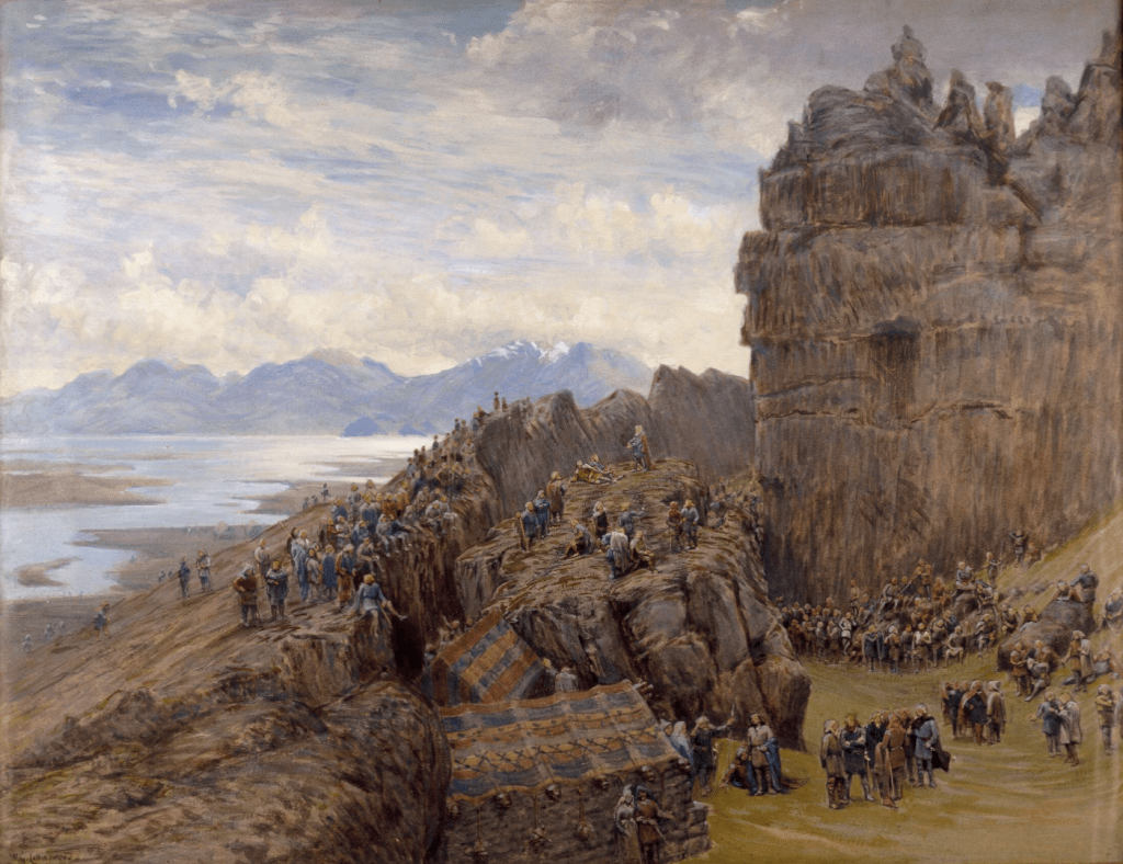 Some Scandinavian thing sites simply carry a mythical or magical atmosphere, like those of Gulating in Norway, Þingvellir ‘assembly plains’ on Iceland, and Tingwal on Orkney. A landscape stressing the sacred proceedings at the thing. The thing site itself was usually enclosed. This could be an enclosure shaped by natural boundaries, whether or not completed with handmade earthen structures. In addition, the thing site could also be marked by stringing a rope or a fence.