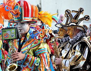 The Carnival of Binche is an annual event in the Belgian town of Binche during the Sunday, Monday, and Tuesday preceding Ash Wednesday. The carnival is the best known of several that take place in Wallonia, Belgium, at the same time. Its history dates back to approximately the 14th century, and since 2003, it is recognised as a Masterpiece of the Oral and Intangible Heritage of Humanity by UNESCO.[3]