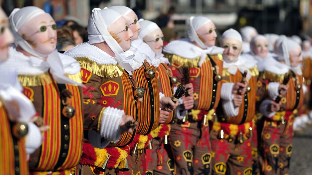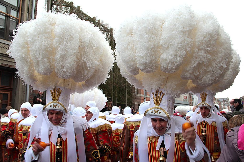 The three-day Carnival of Binche, near Mons, is one of the best known in Belgium. It takes place around Shrove Tuesday (or Mardi Gras) just before Lent (the 40 days between Ash Wednesday and Easter). Performers known as Gilles wear elaborate costumes in the national colours of red, black and yellow. During the parade, they throw oranges at the crowd.
