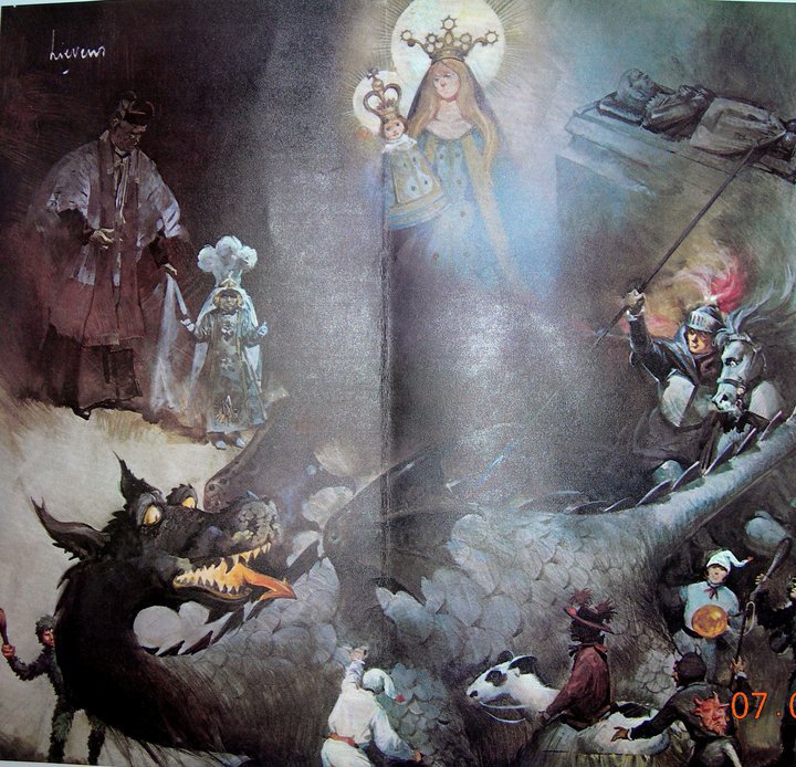 In the Golden legend, printed in English in 1230 it contained a detail of St George’s career that had strangely hitherto gone unmentioned in the voluminous annals of the saint’s life. Almost a thousand years after his supposed death George was to become famous all over the world for what was his most fabulous exploit of all—the slaying of a dragon. And the folklores of Hainaut are very found of it.