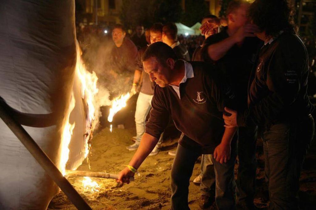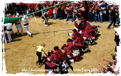 This game is played on the Trinity Sunday between 12:30 (p.m.) and 13:00 (1 p.m.). It represents the fight between Saint George (the good) and the dragon (the evil). The fight is called Lumeçon. This name comes from the old French name Limaçon (old French name meaning a spectacle with horses that made circular movements.)