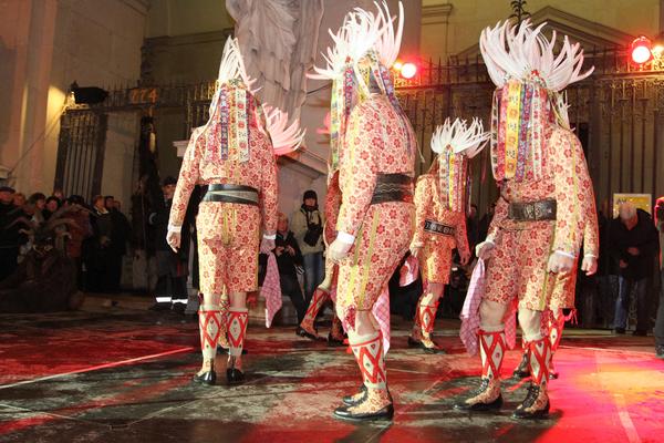 From dawn on the morning of the carnival’s final day, Gilles appear in the centre of Binche, to dance to the sound of drums and ward off evil spirits with sticks.] Later during the day, they don large hats adorned with ostrich feathers, and march through the town with baskets of oranges. These oranges are thrown to, and sometimes at, members of the crowd gathered to view the procession] The vigour and longevity of the orange-throwing event has in past caused damage to property – some residents choose to seal windows to prevent this. The oranges are considered good luck because they are a gift from the Gilles and it is an insult to throw them back.