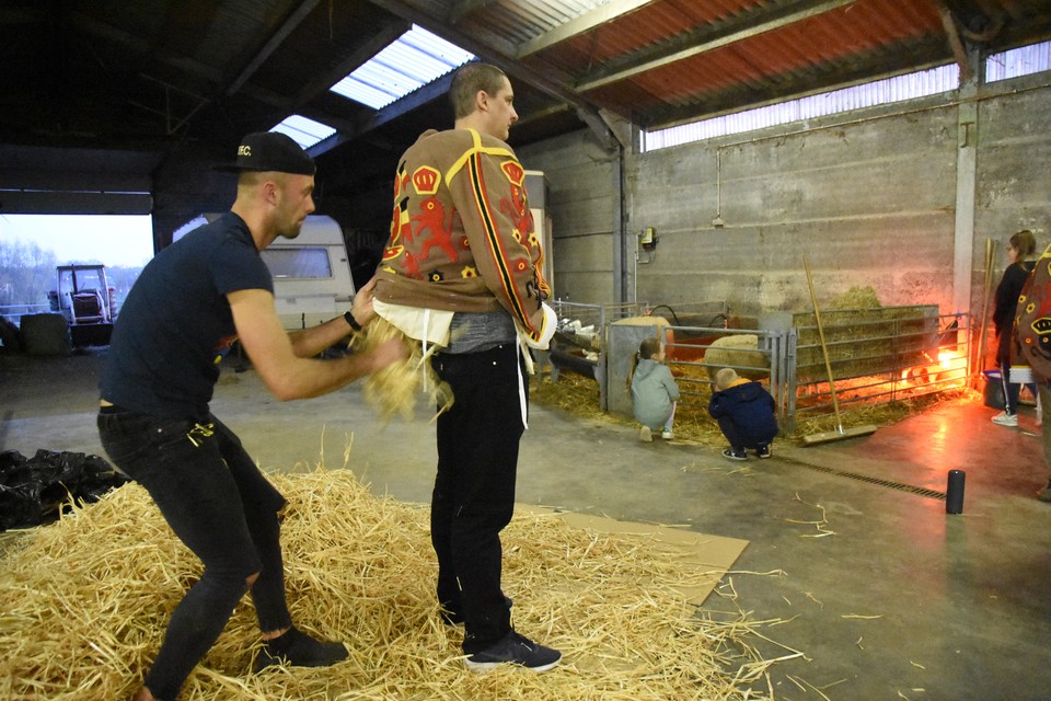 The combat happens on the Grand Place of Mons. The length of the dragon is about 10 metres (33 ft). The end of his tail is covered with horses’ hairs (mane). The dragon is displaced with the help of the white men (French: Hommes blancs). Saint George is protected by the Chinchins who represent dogs. The dragon is helped by the devils (French: Les diables). Each devil is armed with a cow bladder full of air (the balloon in the past before plastic had been developed). With this weapon, they knock the Chinchins and the public that are placed all around the arena. The dragon attacks Saint George with his tail. The dragon also attacks the public. So the public is also an important participant in the fight. People try to take the mane of the tail because it is said to bring luck for a year. Finally, there are also the Leaf men (French: Hommes de feuilles) that are covered with real leaves of ivy. They help the dragon by defending and supporting his tail.