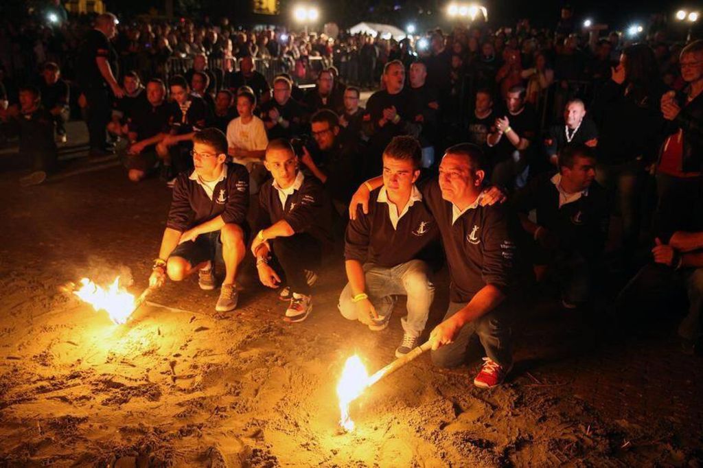 The descent of the shrine takes place on the Saturday evening. During a religious ceremony, the shrine is taken down from its altar. The priest gives the shrine (kept all year in the Collegiate Church of St. Waudru) to the town authorities for the duration of the festival. Then a procession with torches begins in the streets of the town.