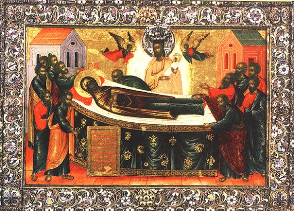 The Dormition of the Mother of God is a Great Feast of the Eastern Orthodox, Oriental Orthodox and Eastern Catholic Churches which commemorates the “falling asleep” or death of Mary the Theotokos (“Mother of God”, literally translated as God-bearer), and her bodily resurrection before being taken up into heaven. It is celebrated on 15 August (28 August N.S. for those following the Julian Calendar) as the Feast of the Dormition of the Mother of God. The Armenian Apostolic Church celebrates the Dormition not on a fixed date, but on the Sunday nearest 15 August.