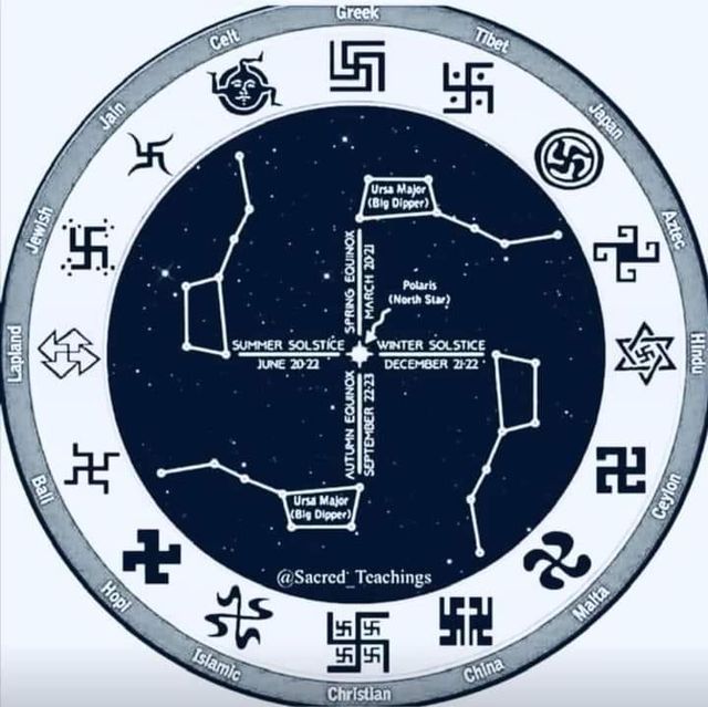 (a stylised 禄 lù and/or 子 zi character, meaning respectively “prosperity”, “furthering”, “welfare” and “son”, “offspring”. 字 zì, meaning “word” and “symbol”, is a cognate of 子 zi and represents a “son” enshrined under a “roof”. Lùxīng (禄星 “Star of Prosperity”) is Mizar (ζ Ursae Majoris) of the Big Dipper or Chariot constellation (within Ursa Major) which rotates around the north celestial pole; it is the second star of the “handle” of the Dipper. Zi was the name of the royal lineage of the Shang dynasty, and is itself a representation of the north celestial pole and its spinning stars (Didier, p. 191 and passim). Likewise to the Eurasian swastika symbols, representations of the supreme God manifesting as the north celestial pole and its Chariot (Assasi, passim; Didier, passim), the lu or zi symbol represents the ordering manifestation of the supreme God of Heaven (Tiān 天) of the Chinese tradition. Luxing is conceived as a member of two clusters of gods, the Sānxīng (三星 “Three Stars”) and the Jiǔhuángshén (九皇神 “Nine God-Kings”). The latter are the seven stars of the Big Dipper plus two less visible ones thwartwise the “handle”, and they are conceived as the ninefold manifestation of the supreme God of Heaven, which in this tradition is called Jiǔhuángdàdì (九皇大帝, “Great Deity of the Nine Kings”) (Cheu, p. 19), Xuántiān Shàngdì (玄天上帝 “Highest Deity of the Dark Heaven”) (DeBernardi, pp. 57–59), or Dòufù (斗父 “Father of the Chariot”). The number nine is for this reason associated with the yang masculine power of the dragon, and celebrated in the Double Ninth Festival and Nine God-Kings Festival (DeBernardi, pp. 57–59). The Big Dipper is the expansion of the supreme principle, governing waxing and life (yang), while the Little Dipper is its reabsorption, governing waning and death (yin) (Cheu, p. 19; DeBernardi, pp. 57–59). The mother of the Jiuhuangshen is Dǒumǔ (斗母 “Mother of the Chariot”), the female aspect of the supreme (Cheu, p. 19; DeBernardi, pp. 57–59). Source#1: Didier, John C. (2009). “In and Outside the Square: The Sky and the Power of Belief in Ancient China and the World, c. 4500 BC – AD 200”. Sino-Platonic Papers. Victor H. Mair (192). Volume II: Representations and Identities of High Powers in Neolithic and Bronze China Source #2: Assasi, Reza (2013). “Swastika: The Forgotten Constellation Representing the Chariot of Mithras”. Anthropological Notebooks (Supplement: Šprajc, Ivan; Pehani, Peter, eds. Ancient Cosmologies and Modern Prophets: Proceedings of the 20th Conference of the European Society for Astronomy in Culture). Ljubljana: Slovene Anthropological Society. XIX (2). ISSN 1408-032X. Source#3: Cheu, Hock Tong (1988). The Nine Emperor Gods: A Study of Chi Source#4: DeBernardi, Jean (2007). “Commodifying Blessings: Celebrating the Double-Yang Festival in Penang, Malaysia and Wudang Mountain, China”. In Kitiarsa, Pattana. Religious Commodifications in Asia: Marketing Gods. Routledge. Source #5: Ma Pilar Burillo-Cuadrado (2014). “The Swastika As Representation Of The Sun Of Helios And Mithras”. Mediterranean Archaeology and Archaeometry, Vol. 14, No 3, pp. 29-36 Source #6: A reconstruction of Zhū Xī’s religious philosophy inspired by Leibniz :the natural theology of heaven (2014).