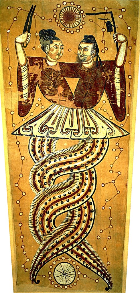 Most challenging are the veils from Taoist-Buddhist tombs at Astana, in Central Asia, originally Nestorian (Christian) country, discovered by Sir Aurel Stein in 1925… We see the king and queen embracing at their wedding, the king holding the square on high, the queen a compass. As it is explained, the instruments are taking the measurements of the universe, at the founding of a new world and a new age. Above the couple’s head is the sun surrounded by twelve disks, meaning the circle of the year or the navel of the universe. Among the stars depicted, Stein and his assistant identified the Big Dipper alone as clearly discernable. As noted above, the garment draped over the coffin and the veil hung on the wall had the same marks; they were placed on the garment as reminders of personal commitment, while on the veil they represent man’s place in the cosmos. (pg. 111-12)…In the underground tomb of Fan Yen-Shih, d. A.D. 689, two painted silk veils show the First Ancestors of the Chinese, their entwined serpect bodies rotating around the invisible vertical axis mundi. Fu Hsi holds the set-square and plumb bob … as he rules the four-cornered earth, while his sister-wife Nü-wa holds the compass pointing up, as she rules the circling heavens. The phrase kuci chü is used by modern Chinese to signify “the way things should be, the moral standard”; it literally means the compass and the square.