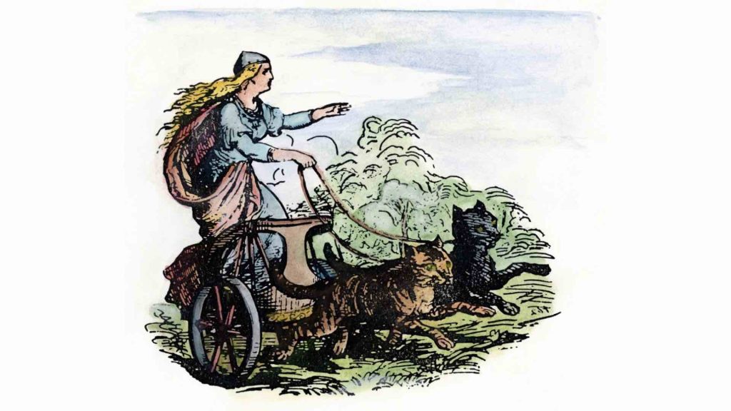 Similarly, in Norse mythology, Freya rides a flying chariot drawn by two great cats. Freya, Inanna, and Astarte are all love-and-war goddesses linked to fertility and the planet Venus, embodying a shared archetype of beauty, power, and cosmic renewal, often depicted with ritual vehicles.