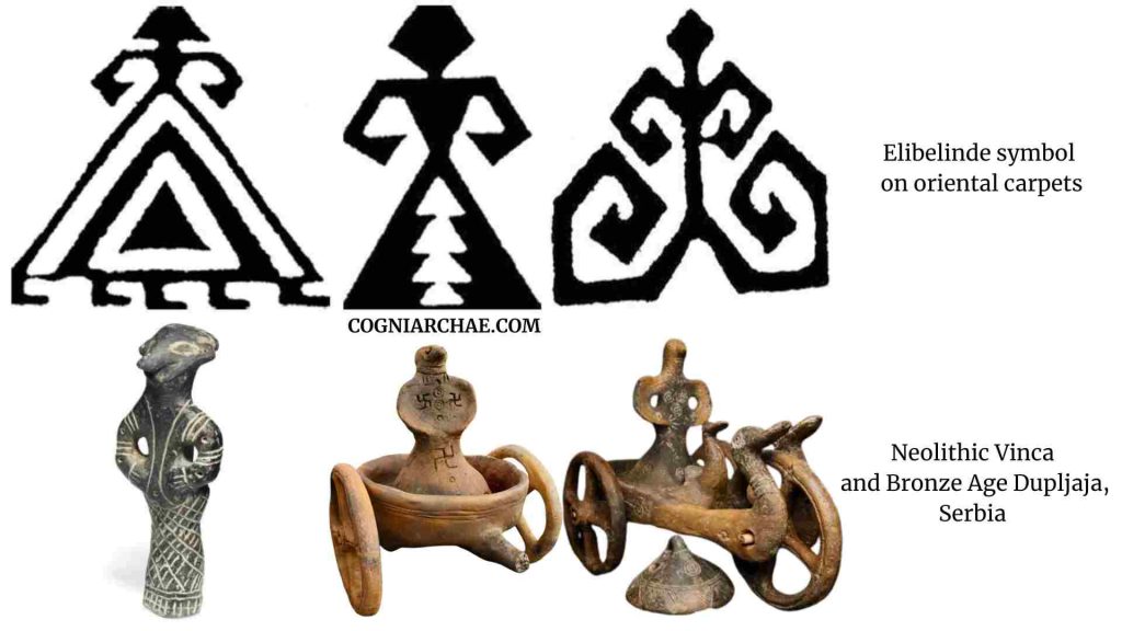 Furthermore, this motif is found in traditional Oriental carpet design, in the symbol known as “elibelinde” — literally “hands on hips” — representing womanhood, marriage, and creation.
