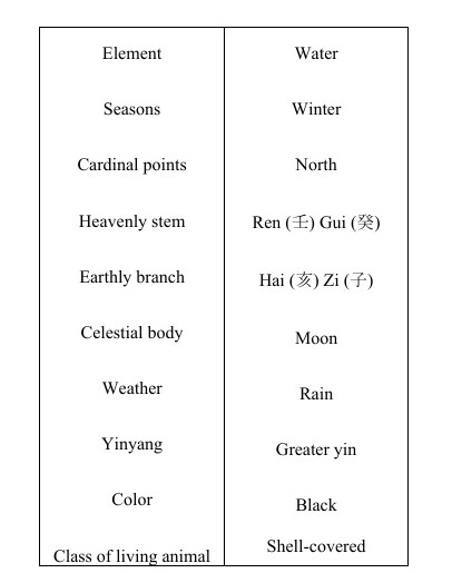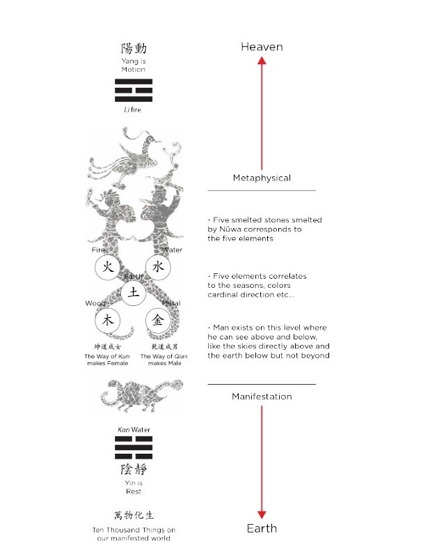 The tortoise therefore assumes the role of an indicator of a larger context; it contains the whole Chinese cosmological view of Yin (earth) and Yang (heaven) symbolized by its plastron and shell respectively, aspects which we will examine more closely in the following chapter. The tortoise is also part of the visual language of our reference, indicating its principles are firmly rooted in the north and its associated aspects. As a macrocosm, the bird and the tortoise both function as indicators of fire and water, heaven and earth, Yang and Yin, as both animals are respectively light and heavy. Together with images of Fuxi and Nüwa, they symbolize the male and female principles under heaven (bird) and atop earth (tortoise). From Zhou Dunyi’s diagram, we can observe the relationships between heaven/earth, fire/water, and male/female.