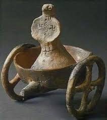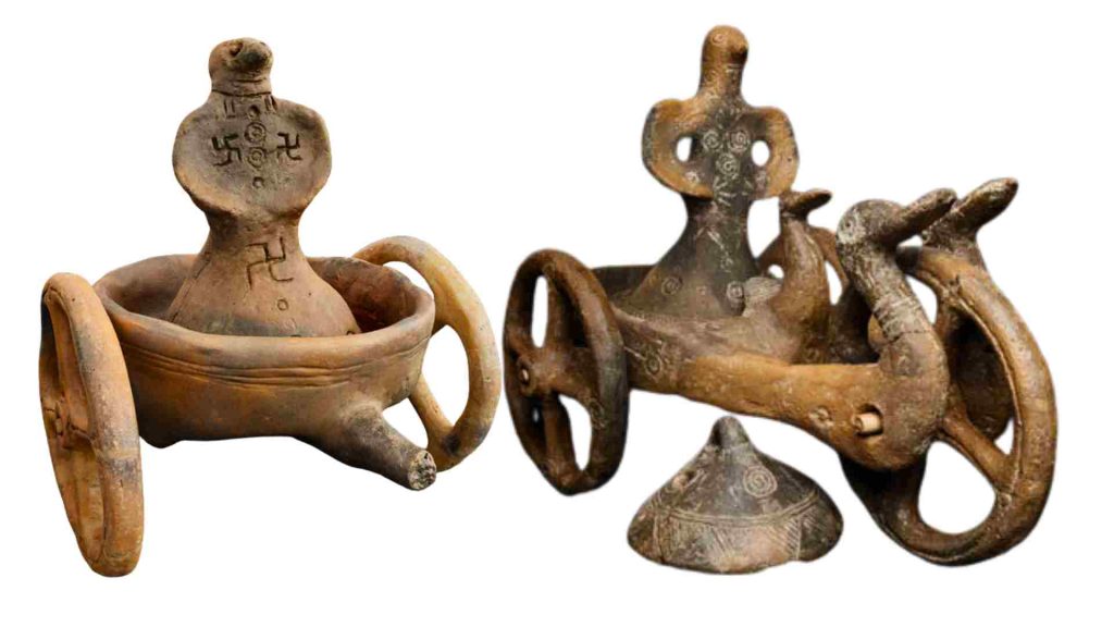 These chariots were found on a cremation ground, but they were burried there after long and deliberate use. Therefore, I don’t believe that their role was to carry the sould to the afterlife, as some have suggested.