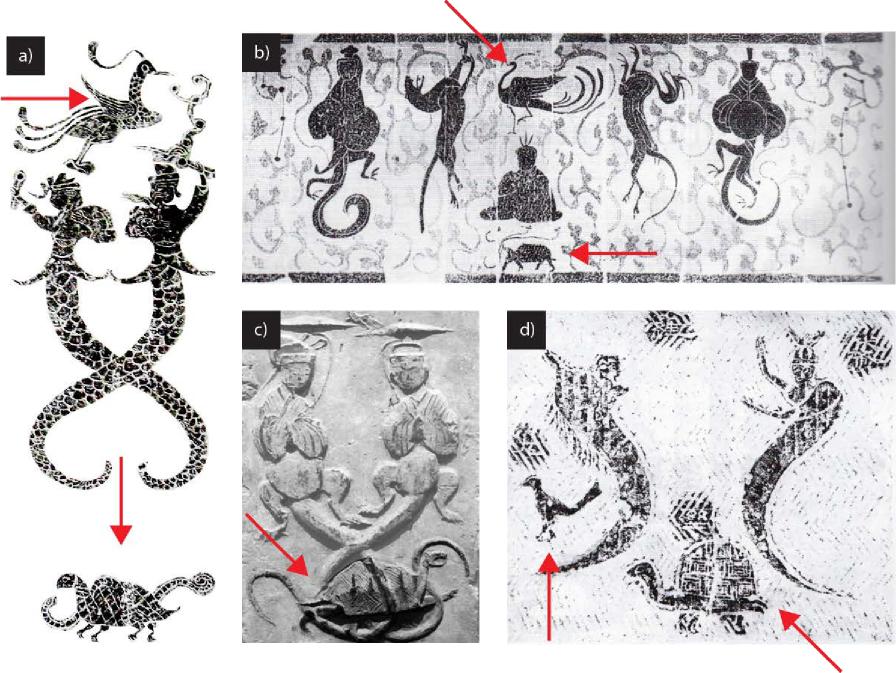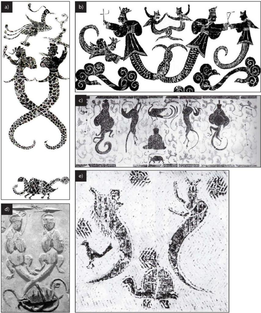 From the myth of Pangu and the tale of Nüwa and Fuxi, it can be inferred that the fire and water have a strong connection to the concept of Yin and Yang. In the various depictions of Fuxi and Nüwa, this view is indeed reinforced and in some images, we notice the presence of the tortoise at the bottom and a bird on the top . In all four images the tortoise is situated at the bottom; a plausible reason for this is its strong association with the earth and the Yin principle. Furthermore, anything above the tortoise shell is considered to be ‘Yang’ or heaven, because the shell symbolizes the round, domed shape of heaven. Hence, the tortoise ‘supports’ images that are above it in the realm of heaven.