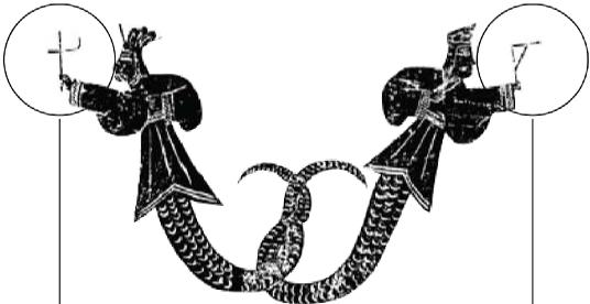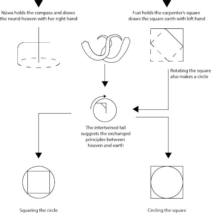 Images of Nüwa usually depict with a partner figure, Fuxi. In many rubbings and images, they are depicted with human upper bodies with serpentine tails If their tails are entwined, it symbolizes the interaction of Yin and Yang, depicting male and female aspects co-existing as complementary pairs rather than polarities. Similar intertwinement can be observed in images of the tortoise and the snake. Nüwa and Fuxi5 appear together holding a compass (gui) and a square respectively (ju). Together, they represent stability and order, and this was exactly what the pair introduced into the world when it was engulfed in turmoil and unrest. Fuxi was known as the sage that taught mankind how to hunt and cook, and, together with Nüwa, he established the four seasons. The introduction of order and harmony in the world was achieved by the use of two special tools, the compass and the square. Nüwa holds the compass while Fuxi holds the square; the tools are correlated with the circular heaven and the square (or rectilinear) figures of Earth and Heaven respectively . Guénon suggests that the opposition of the square and circle suggests a passage from the human state, represented by the earth and can be directly perceived by man, to the supra-human states, represented by heaven. In other words, the tools represent a passage from the domain of the ‘lesser mysteries’ to that of the ‘greater mysteries.’