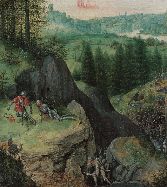 Moving back toward the middle ground, the spears recede into a small plateau on which a horrible slaughter has taken place. On a rocky ledge to the left, Saul and his armor-bearer have impaled themselves on their swords as four of the uncircumcised wend their way around the rocks to ‘abuse’ them. Finally, we move off to an idyllic landscape incongruously conveying peace and tranquility, as in the Icarus painting .