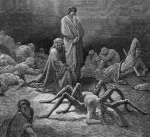O folle Aragne, sì vedea io te già mezza ragna, trista in su li stracci de l’opera che mal per te si fé. (Purg. 12.43-45)