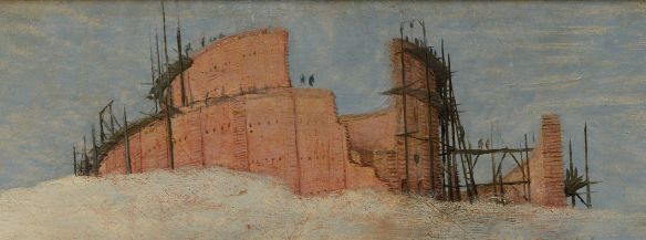 The detailed illustration of the frenzied efforts of the engineers, masons and labourers suggests a second moral – the pointlessness of human endeavour, a theme also touched on Nimrod’s doomed building was used to illustrate this meaning in Sebastian Brant’s Ship of Fools.