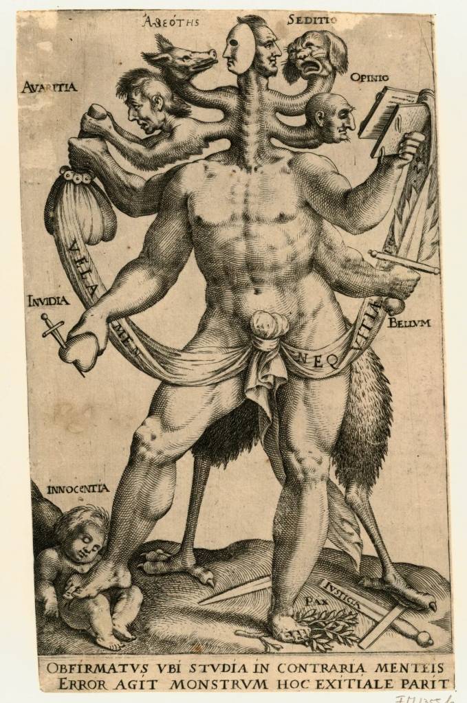 Mirror of moder man: The drawing shows the five-headed and four-legged monster. This monster has the heads of Avarice (Avaritia), Stupidity (Stupiditas), Deceit (Fraus), Sedition (Seditio) and Opinion (Opinio). In his hands, he bears attributes of Envy (Invidia) and War (Bellum). Under his feet, he tramples the Innocence and Peace (Pax) and Justice (Justitia). With inscriptions in Dutch and Latin. (1616)