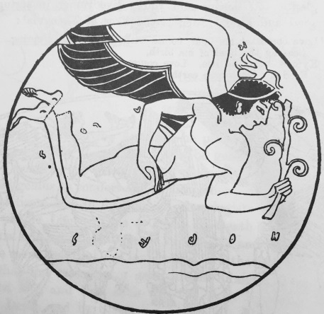 Eros portrayed on a red-figured cylix, holding a spray of flowers, as the creative spirit moving upon the waters. Cf. Genesis 1:2, and so likewise Sophocles (Ant. 781): “O rover of the seas, O terrible one/In wastes and wildwood caves,/None may escape thee, none.”