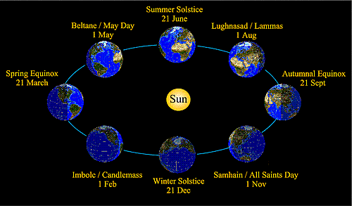 Emer called the opening of spring Imbolc, after the lactation and milking of ewes which began at that time of year . Thus, for Ireland anyway, was created what is commonly called the Celtic calendar. Our practice of dividing the seasons at the equinoxes and solstices is relatively recent, coming to full fruition only in the 20th century, following the lead of America. But even today in America, we still have at least three holidays marking the old seasonal divisions: Groundhog Day, May Day, and Halloween. (The first-fruits or harvest festival of August 1 is not observed here in our industrialized society, but it continues in some places, such as Lughnasa in Ireland.)
