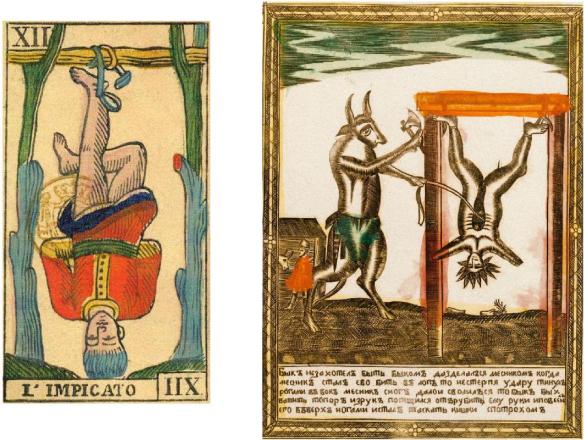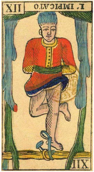 The Hanged Man. Trump card from the Liguria Piedmont Tarot; Italy, 1860.