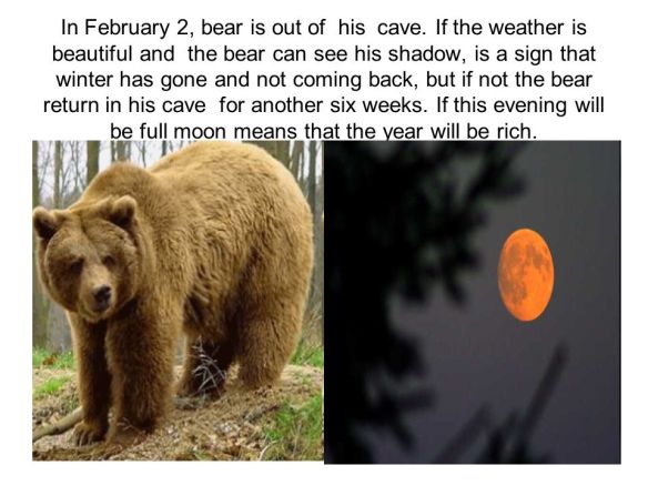 Only when the population of bears in Europe was diminished did people resort to hedgehogs as a substitute for divination on this day. Bears were the largest, most powerful and magnificent creatures in Europe, the king of beasts, like lions in the more southern climes. Venerated since prehistoric times, the bear was the oldest zoomorphic deity (Campbell, p. 127), and they have figured prominently in myths, folktales, and art. Some of their traits are similar to humans, so they were viewed in anthropomorphic (including totemic) terms, often viewed as the ancestors of humans. They also could move between worlds, and thus were thought even to instruct shamans. Importantly, they also were considered spirit or soul animals, and their shadow was thought of as their soul.