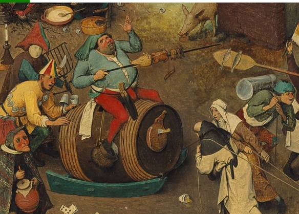 Carnival has its origins in the ancient Greek and Roman world. In Greece the principal festival of dissolution was the Kronia, held after the summer harvest and thus representing the transition into the post-harvest regime of life heading towards winter. It is named after the Titan Cronos, who according to myth ruled the universe during the Golden Age of mankind, where there was no hunger, death, sickness, or social distinctions or oppression. But then Zeus established the later order of the cosmos by defeating Cronos in battle. Zeus imprisoned Cronos for a while in the underworld realm of Tartarus, but eventually let him out and assigned him to rule over the Elysian Islands, a paradise of the dead where, among other things, again there was a primordial equality with no social distinctions, and other features of the Golden Age. Kronia reflects this legacy of Cronos (as well as perhaps his originally being a harvest god – he did, after all, wield a sickle). During the festival the usual order of society was suspended. Among other things, slaves banqueted and played games with their owners, who waited on their slaves, who ran riot through the streets making noise. This represented a reversion to the Golden Age of Cronus when oppression and social distinctions did not exist . At the end of the festival, a criminal who had previously been condemned to death (a mark of chaos and disorder) was led out, given wine, and slain. This marked the end of dissolution and the moment of transition into the next seasonal modality of being.