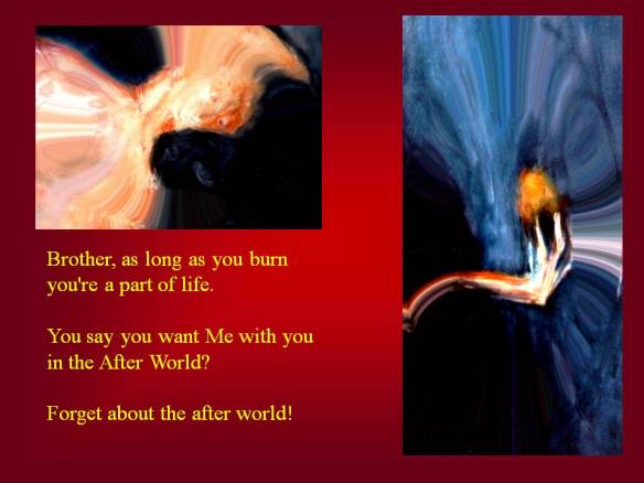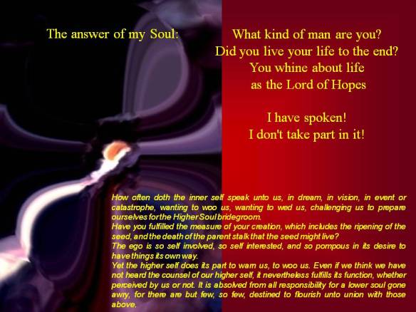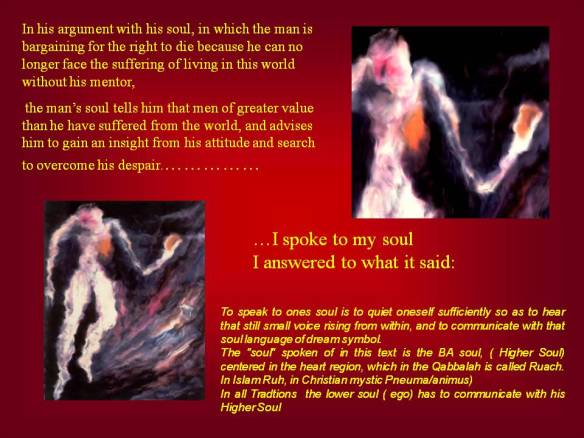 “The man’s soul tells him that men of greater value than he have suffered from the world, and advises him to gain an insight from his attitude and search to overcome his despair.