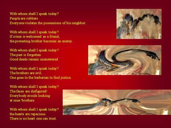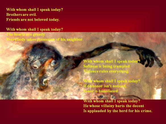 When we consider the age of this text, from XII Dynasty Egypt (approx 1991-1783 BC), we can see that the nature of the woes and troubles of humankind have changed very little.