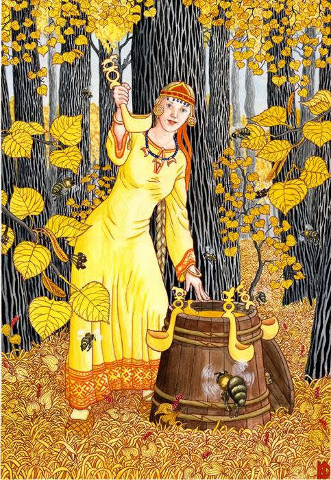 The Slavic name for linden “lipa” derives from the word “lipnut”, i.e. to stick, for its juice was known for being sticky. Linden was associated with femininity and softness, qualities opposite to the ones of the “masculine” oak. Aside from its association with women, Slavs honored linden as “mother of trees”, giver of life – for linden bark could be used to make shoes and ropes, its wood is good for making household objects, and honey that bees make out linden flowers is believed to have healing properties as linden blossoms help reduce fever and induce sweating. Linden is frequently associated with qualities of Goddess Lada. In Russian folk art and lore beautiful linden was a lover of oak or maple (both symbols of masculinity).