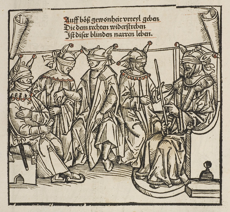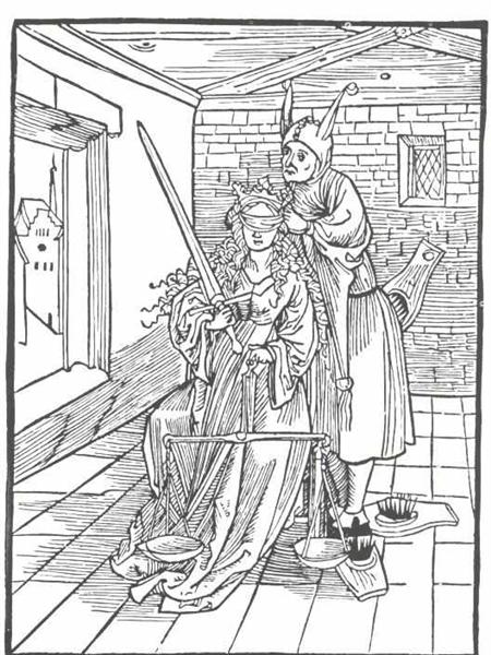 But suddenly at the end of the 15th century, a blindfold began to be placed over the goddess’s eyes, producing what has rightly been called »the most enigmatic of the attributes of justice.« Perhaps the earliest image showing the change is a 1494 wood engraving of a Fool covering the eyes o fju stice, illustrating Sebastian Brant’s Narrenschiff (Ship of Fools], which was rapidly reproduced in translations throughout Europe.