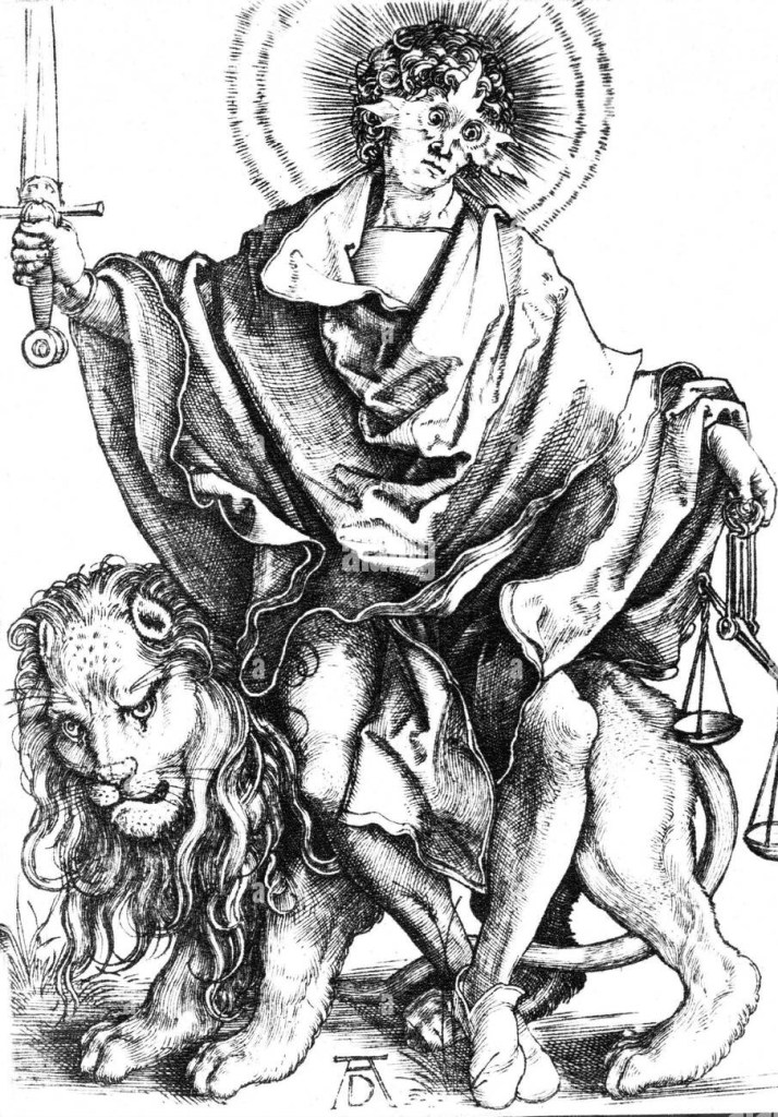 Dürer’s engraving creatively combines pagan, astrological and Biblical symbols. The central figure sitting on a lion is at once Christ, the Roman goddess of justice Justitia, and the ancient sun god, called Helios by the Greeks and Sol by the Romans. He holds Justitia’s scales and a double edged sword, but unlike the traditionally blindfolded goddess, his eyes— wide and confrontational— see all. His legs are crossed, the customary sitting position for judges in ancient law books and a stance adopted in many other Renaissance depictions of leaders. His mask is composed of three prongs of flame. While this number suggests the Christian Trinity, its beaming rays are a strong gesture toward Sol.