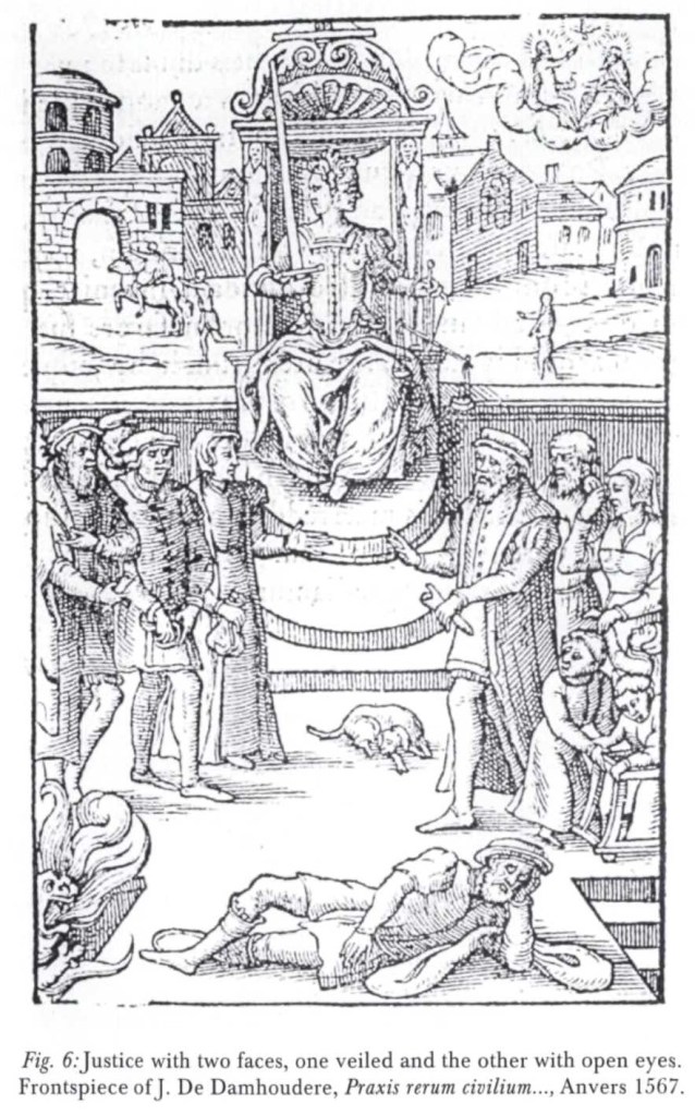 Still, it was during the 16th century that we began to see blind justice as representing honesty and impartiality, rather than stupidity and corruption. Andrea Alciati’s 1582 Operaomnia shows the central figure at a tribunal as blindfolded, apparently representing fairness. Interestingly, his colleagues are without hands, to show they have received no bribes. This nice touch for showing honesty never caught on. Perhaps one Venus de Milo is enough.