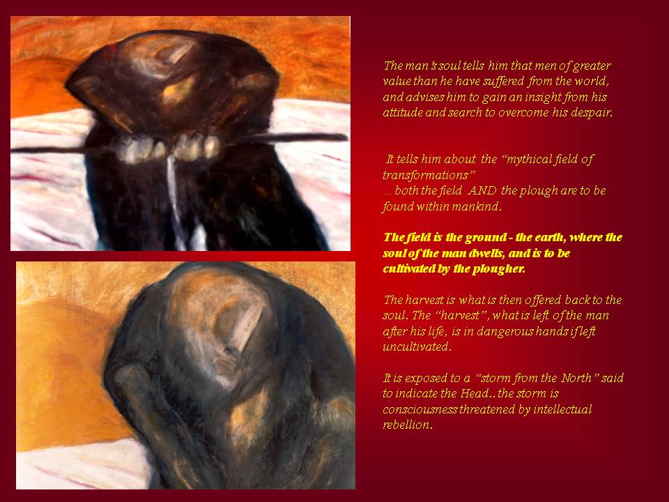 The man’s soul tells him that men of greater value than he have suffered from the world, and advises him to gain an insight from his attitude and search to overcome his despair.  It tells him some allegorical stories – the first being the “mythical field of transformations”; both the field AND the plough are to be found within man. The field is the ground; the earth, where the soul of the man dwells, and is to be cultivated by the ploughman – the man must “cultivate” himself.