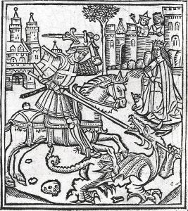 The association of Saint George with the dragon was not attested to until the twelfth century version of Miracula Sancti Georgii (Codex Romanus Angelicus 46, pt. 12, written in Greek).[40] Jacobus De Voragine, the thirteenth-century archbishop of Genoa, helped promote the legend of the dragon with his publication of The Golden Legend around 1260. By the fourteenth century the Golden legend had become one of the most popular religious works of the Middle Ages and helped spread the legend of the dragon.[41] In De Voragine’s version of the legend, the dragon was in the city of Silena in the province of Libya in the middle east. However, as the tales were carried across Europe, the location of the dragon varied. For instance in some German versions the dragon would come to the area above the village of Ebingen and would disappear into the southern slope of Schonberg mountain in Liechtenstein.[42] In these legends, Saint George slays a dragon to liberate a princess and is thanked by the town people.