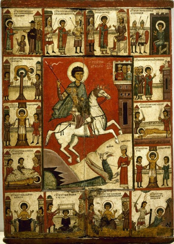 St. George’s attribute is a red cross on a white field, usually seen on a banner or on his shield. Most portraits also have him in armor and place a defeated dragon at his feet. (See the description page for this image and the page explaining the iconography of images of this saint.)