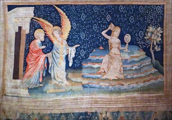 The scene of “Babylon, the Great Prostitute”: symbol of all abominations, From the tapisseries of the Apocalypse of Angers;She is seen styling her long hair,which in the Middle Ages is a sign of prostitution . This prostitute has a pretty face and she is looking in a mirror … but the mirror reflects another face, a great ugliness! This is the reality of the soul of this prostitute because the mirror is a symbol of truth and it is also the sign of the heart.She is represented sitting on a hill watered by four rivers: “These waters are peoples, crowds, nations, languages”. She looks at herself in a mirror but the reflection that it sends back to her is that of a very ugly face (image of her soul).“On her forehead was written a name, a mystery: Babylon the great, the mother of immorality and abominations of the earth. And I saw this woman drunk with the blood of the saints and the blood of the witnesses of Jesus … “”And the woman you saw is the great city that has kingship over the kings of the earth. »Having seen these details, we are now informed: She is the great prostitute of Babylon. Babylon means “the door of the Gods”. It is said in the Bible that Babylon was previously a golden cup in the hands of Yahweh but it fell and became the sign of pride. This woman here represents all the pride of the world, all the temptations that we are constantly confronted with in our daily lives and to which we often succumb. In the days of John, the seven hills watered by four rivers obviously refer to the city of Rome and the pride of this imperial Rome which imposes its yoke everywhere in the world.There is a sign of hope anyway in the tapestry with this angel with orange wings, the color of light and pointed towards the sky. He leads Jean by taking him by the hand … indicating that we are never alone. In the background, Hennequin of Bruges has also, once again, placed the bivium of Pythagoras, this sign which leaves us free to choose the path of good or the path of evil.