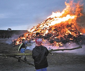 NLD-20010430-TEXEL: Over het gehele eiland Texel branden op de laatste avond voor de maand mei tal van hoog oplaaiende vuren, Meierblis genoemd. Jongeren poffen hun aardappelen en velen stoken er kleine vuurtjes omheen. Het is een gebruik dat lijkt op de Twentse paasvuren en is bedoeld als blijdschap voor de terugkerende lente. ANP FOTO/KOEN SUYK