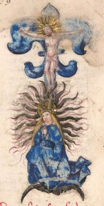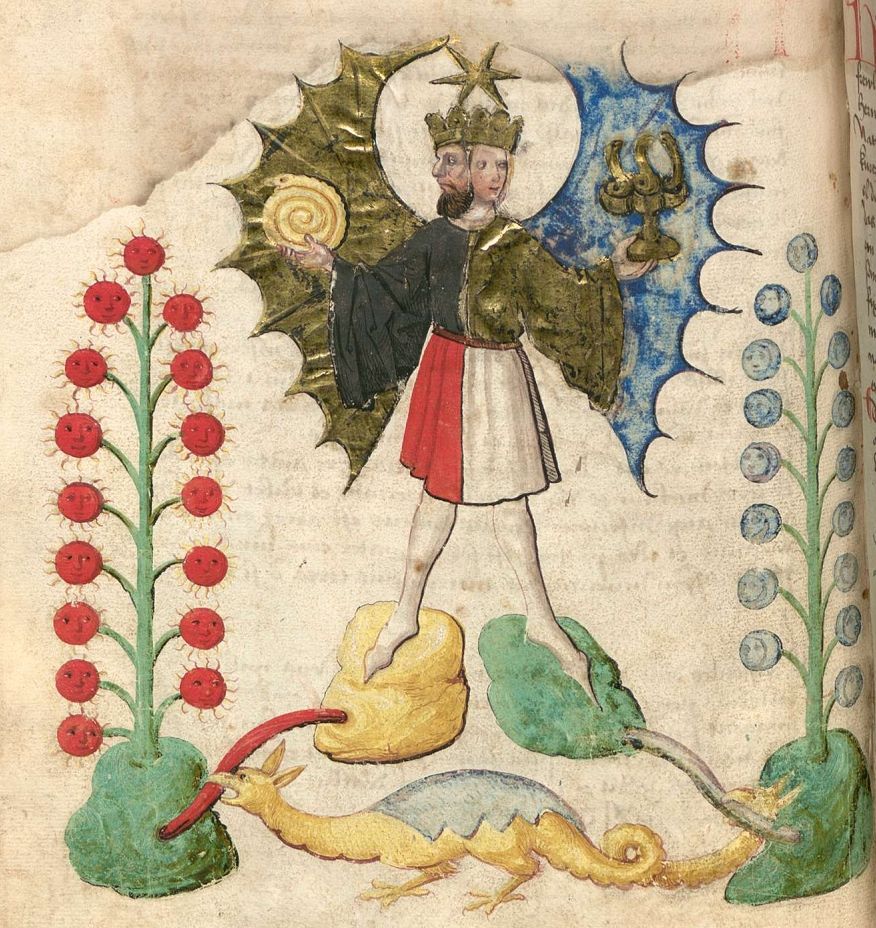 The “Emerald Table”, body of the Hermetic doctrine, describes the Rebis as generated by the Sun and Moon. However, Moon is always subordinated to Sun as she is only reflecting his light. Therefore, she represents the passive or feminine principle whereas the Sun portrays the active or masculine principle. This seems to contradict the meaning drawn from the first picture where the feminine and masculine aspects were respectively associated with the active and passive principles.