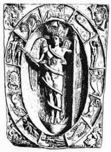 The cloudy belt symbolizes the Cosmic Egg. Its division into two halves portrays the polarization of the primeval Unit. The egg contains a character potentialized according to masculine and feminine aspects and distinguished alongside a vertical axis. The Zodiac signs, outside the egg and representing the Cosmos, let us know that this axis links both equinoxes, probably a reference to the time when the annual cycle started with Spring.