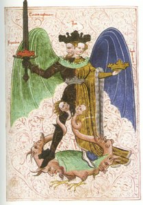 Both the androgyne and the hermaphrodite represent a common idea expressed in medieval and Renaissance alchemy by the figure of the “Rebis” (from the Latin res bina, “double matter”), depicted as a double-headed figure . The Rebis was the end product of the “Great Work” in which opposing qualities were reunited. This “Chemical Wedding” was a union of opposites: hot and dry sulphur and cold and moist mercury where the color red represented the male and the color white represented the female parts. Another common element in the symbolism was the depiction of the Sun (male) and Moon (female) above, or in the hands of the figure.