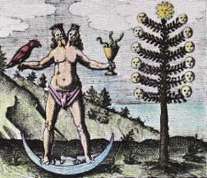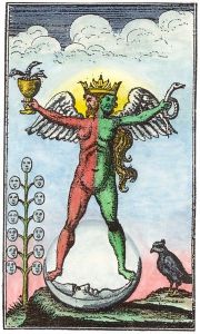 A bird, representing the immutable Principle in comparison with the moving manifestation, sits motionless on the right hand. The left hand holds a vase from which three snakes are emerging. The central snake symbolizes the vertical axis or “World Axis” around which winds both cosmic force currents in reverse directions. As the former picture, the last one represents, at the same time, the primordial Androgyne and the return path to this state. This last aspect is reinforced by the presence of the tree on the right, which depicts the seven degrees of the hermetic initiation. The first six are represented by couples of faces symmetrically located on each side of the trunk as they still refer to the manifested or dualistic world. The last one, symbolized by the Sun situated at the treetop, identifies the being who has re-integrated the primeval Unit. The Moon, taking the shape of a boat on which the Androgyne is standing, indicates that the latest dominates the inferior waters characterizing the dualistic world. It corresponds to the walk on waters common to various traditions, notably Christian.