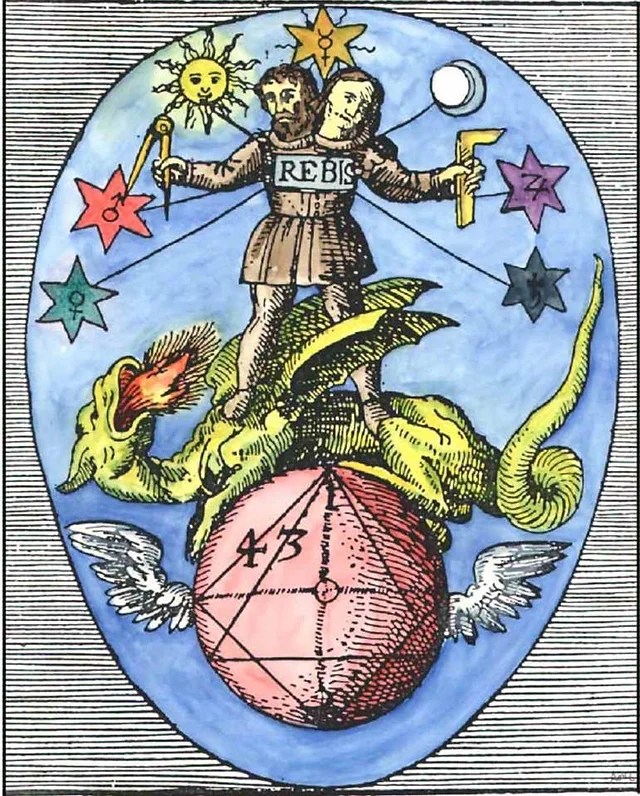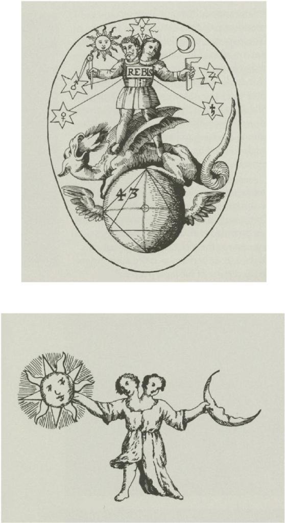 The hermetic Rebis (from “res bina” or double matter) is composed of a body crowned by two heads, one masculine, the other feminine, as on the picture below dating from the beginning of the 17th century.