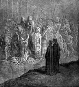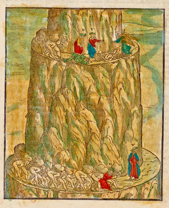 With the passage of each terrace and the corresponding purgation of his soul that the pilgrim receives, one of the “P”s will be erased by the angel granting passage to the next terrace. The angel at Peter’s Gate uses two keys, silver (remorse) and gold (reconciliation) to open the gate – both are necessary for redemption and salvation. As the poets are about to enter, they are warned not to look back. Read more here