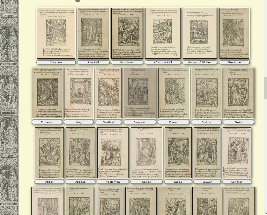 The 1538 edition which contained Latin quotations from the Bible above Holbein’s designs, and a French quatrain below composed by Gilles Corrozet (1510–1568) actually did not credit Holbein as the artist. It bore the title: Les simulachres & / HISTORIEES FACES / DE LA MORT, AUTANT ELE/gammēt pourtraictes, que artifi/ciellement imaginées. / A Lyon. / Soubz l’escu de COLOIGNE. / M.D. XXXVIII. (“Images and Illustrated facets of Death, as elegantly depicted as they are artfully conceived.”)[These images and workings of death as captured in the phrase “histories faces” of the title “are the particular exemplification of the way death works, the individual scenes in which the lessons of mortality are brought home to people of every station.”