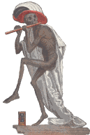 The deathly horrors of the 14th century such as recurring famines, the Hundred Years’ War in France, and, most of all, the Black Death, were culturally assimilated throughout Europe. The omnipresent possibility of sudden and painful death increased the religious desire for penance, but it also evoked a hysterical desire for amusement while still possible; a last dance as cold comfort. The Danse Macabre combines both desires: in many ways similar to the medieval mystery plays, the dance-with-death allegory was originally a didactic dialogue poem to remind people of the inevitability of death and to advise them strongly to be prepared at all times for death (see memento mori and Ars moriendi).