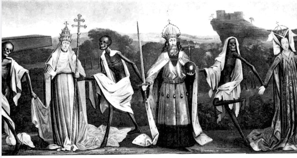 Historian Francis Rapp (1926–2020) writes that “Christians were moved by the sight of the Infant Jesus playing on his mother’s knee; their hearts were touched by the Pietà; and patron saints reassured them by their presence. But, all the while, the danse macabre urged them not to forget the end of all earthly things.” This Danse Macabre was enacted at village pageants and at court masques, with people “dressing up as corpses from various strata of society“, and may have been the origin of costumes worn during Allhallowtide.
