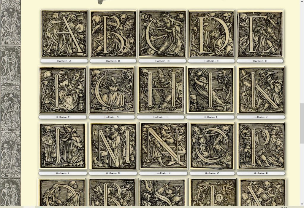 Holbein’s dance of death alphabet was first used in August 1524 (picture to the right). The letters are quite small (2.5 x 2.5 cm), but incredibly detailed. The woodcutter was Hans Lützelburger (= Hans/John from Luxembourg), and we know this because his woodcutter’s mark (picture to the left) appear on some of the sheets that were printed along with the alphabet. Read here